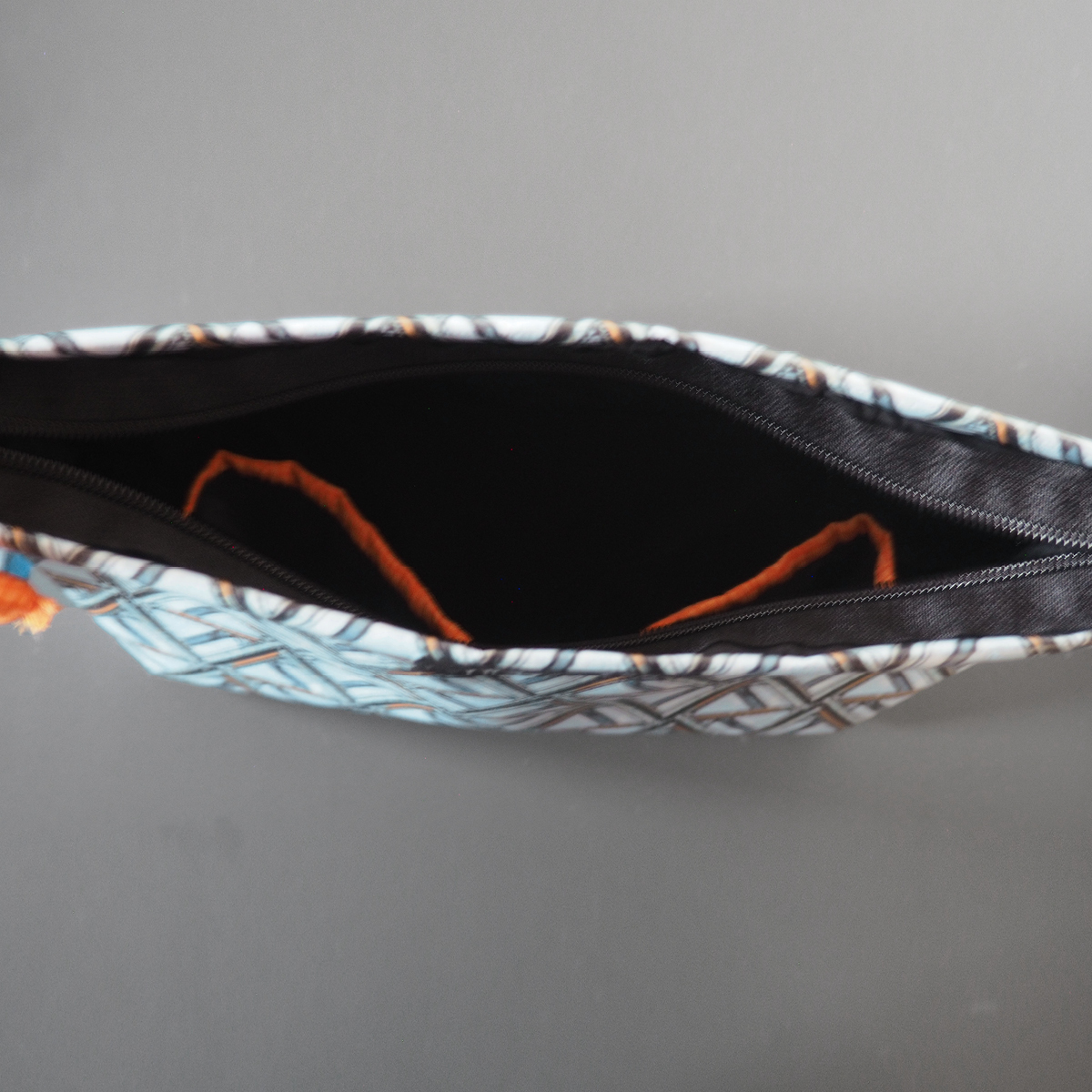 Im Innenfutter sind seitliche Fächer zum Einstecken kleinerer Untensilien eingearbeitet. Dank der orangefarbenen Paspel siehst Du die Fächer auch bei schlechten Lichtverhältnissen sofort.