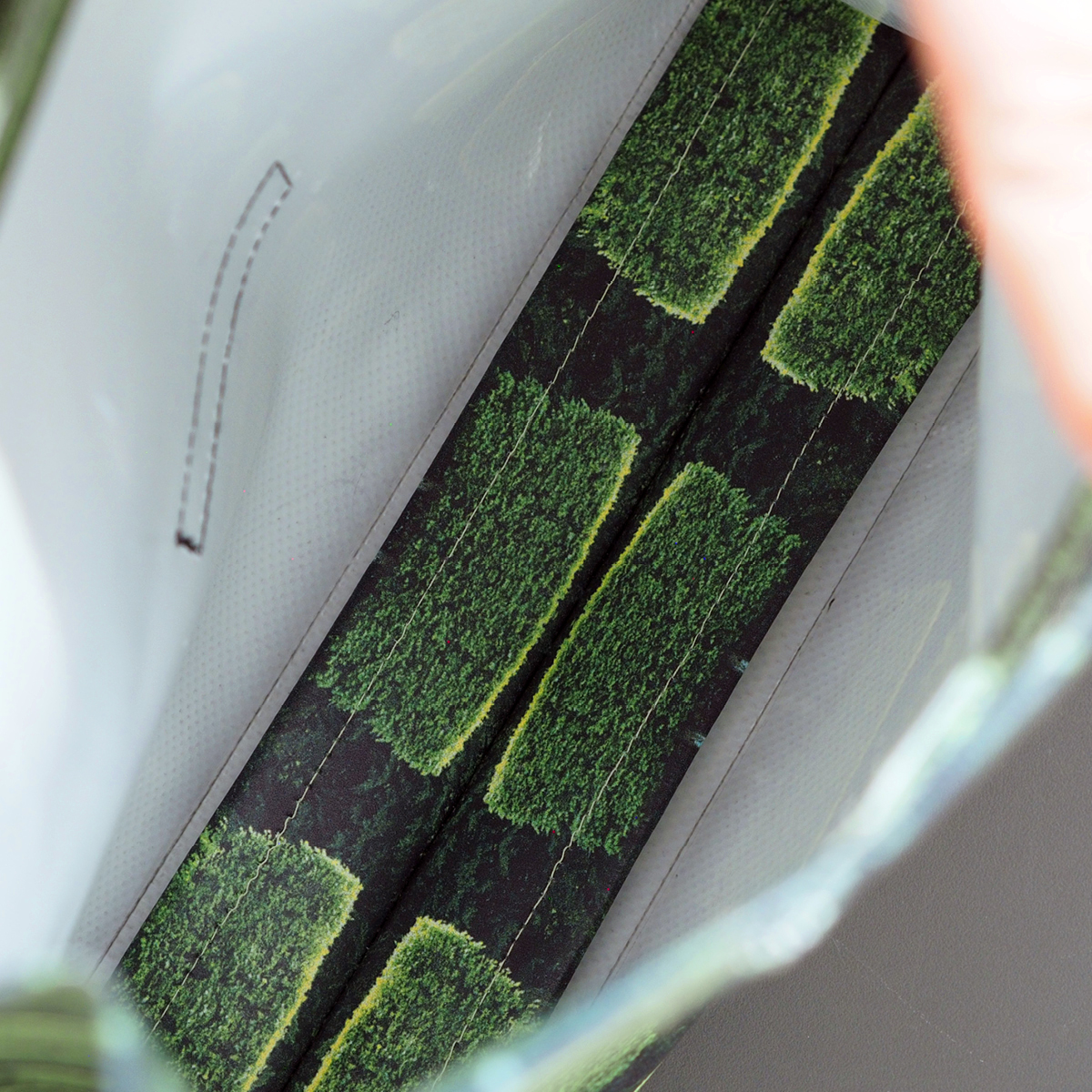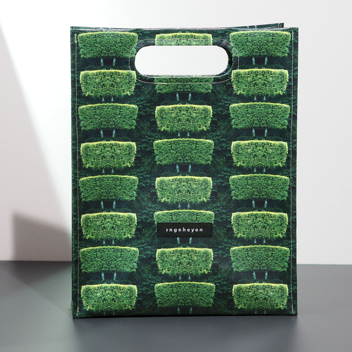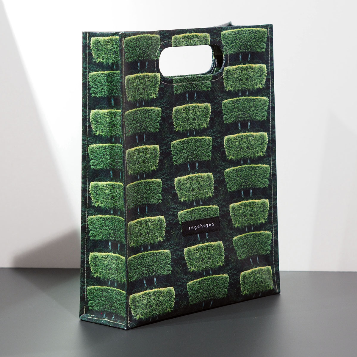 Diese Tasche im Stil einer klassischen Plastiktüte ist aus robustem Planenmaterial genäht. Sie ist ein echter Hingucker. Das Muster Reality Pattern M28 habe ich mit einem Foto von der ehemaligen Reitbahn im Schlosspark von Benrath, Düsseldorf gestaltet.