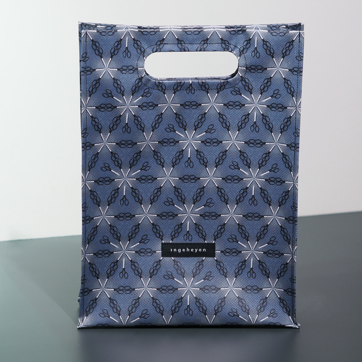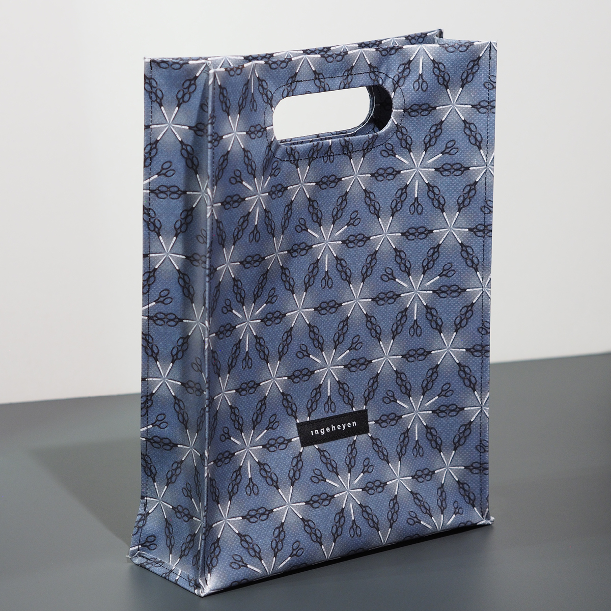 Diese Tasche im Stil einer klassischen Plastiktüte ist aus robustem Planenmaterial genäht. Sie ist ein echter Hingucker. Das Muster Reality Pattern M77 habe ich mit einem Foto von der Museumsschere im Industriemuseum Solingen gestaltet. Diese Schere wird heute noch bei Vorführungen im Museum hergestellt.